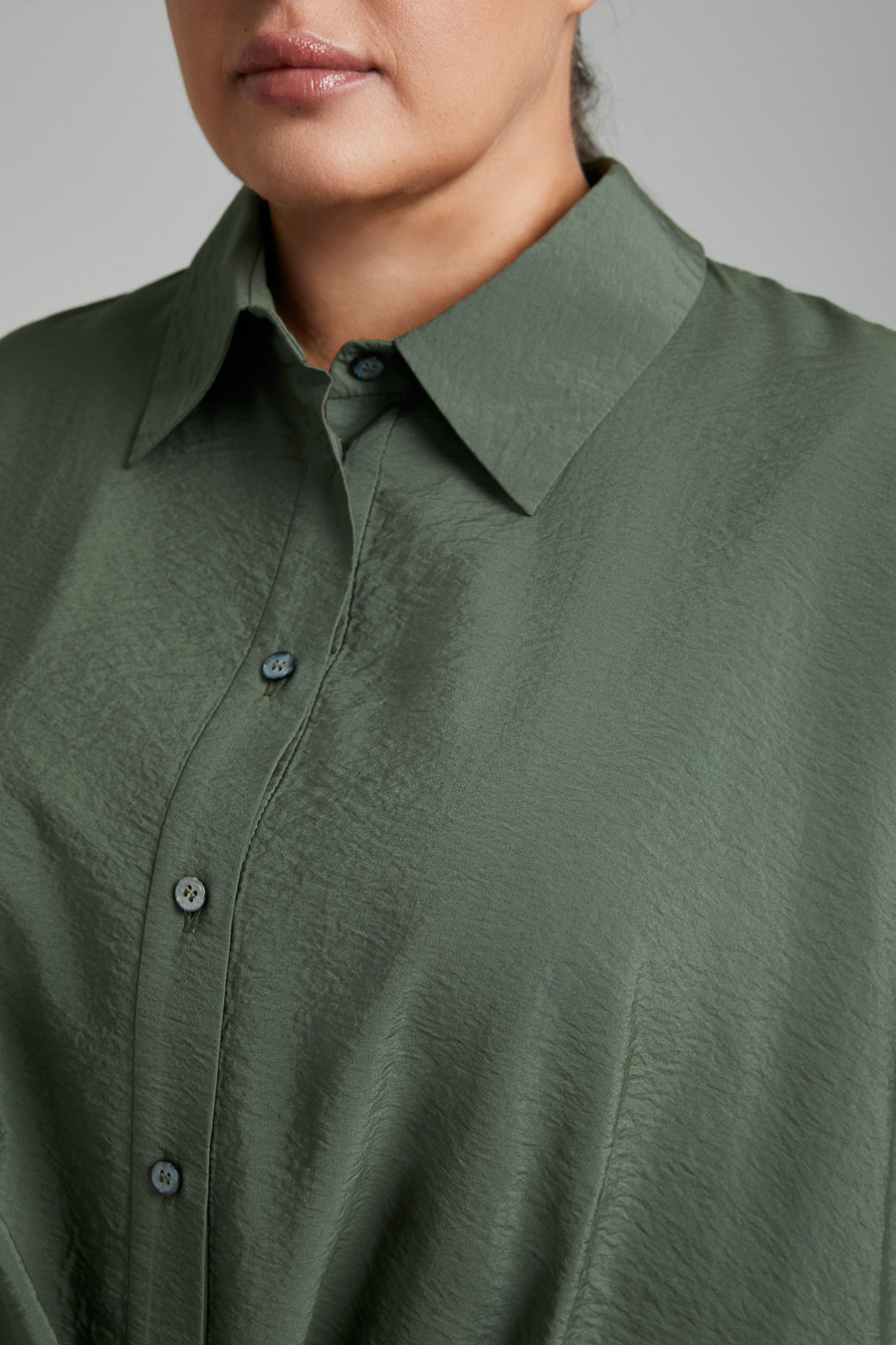 Блузка с цельнокроеным рукавом, с декоративной драпировкой по низу изделия. Застежка - планка на пуговицах.